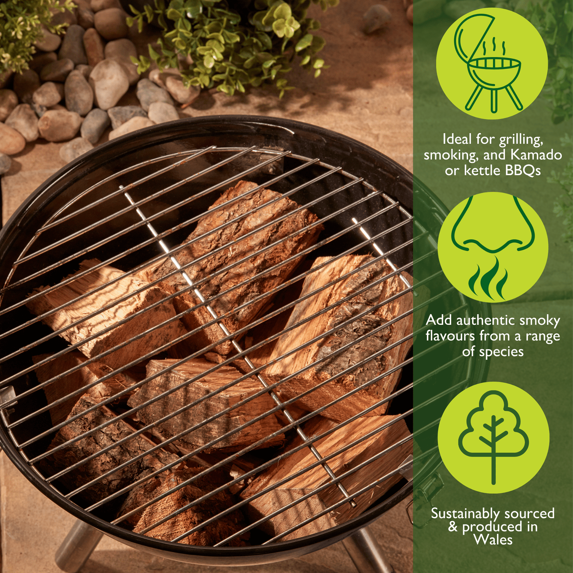 Our natural, kiln dried chunks deliver lasting, authentic smoky flavour and are the perfect size for smokers, Kamado grills, and kettle BBQs. Sourced from our sustainable woodland, our BBQ Smoking & Cooking Chunks offer great value, giving you hours of BBQ flavour with just a few chunks.