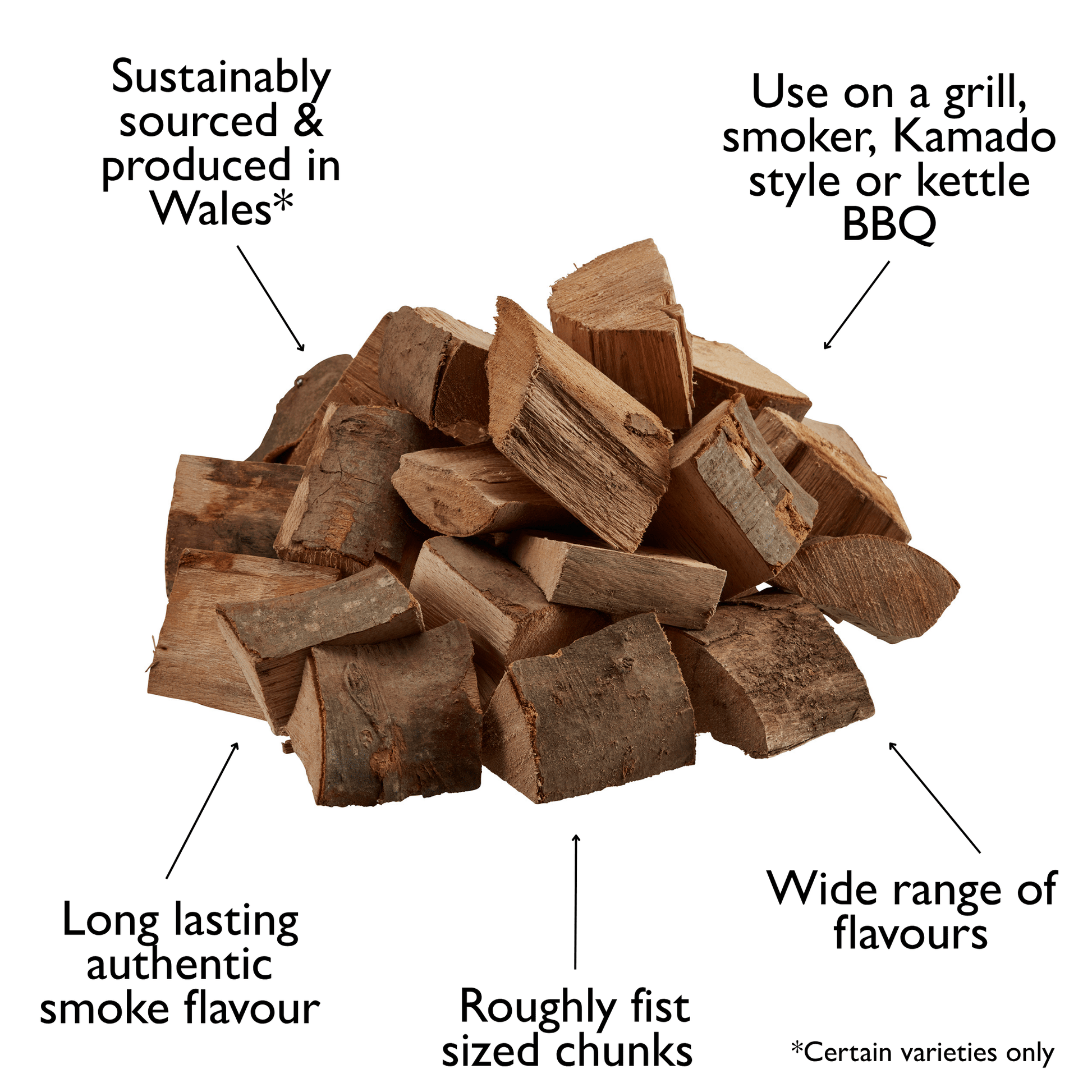 | Flavours | Oak, beech, apple, hickory, alder, cherry and whiskey. |