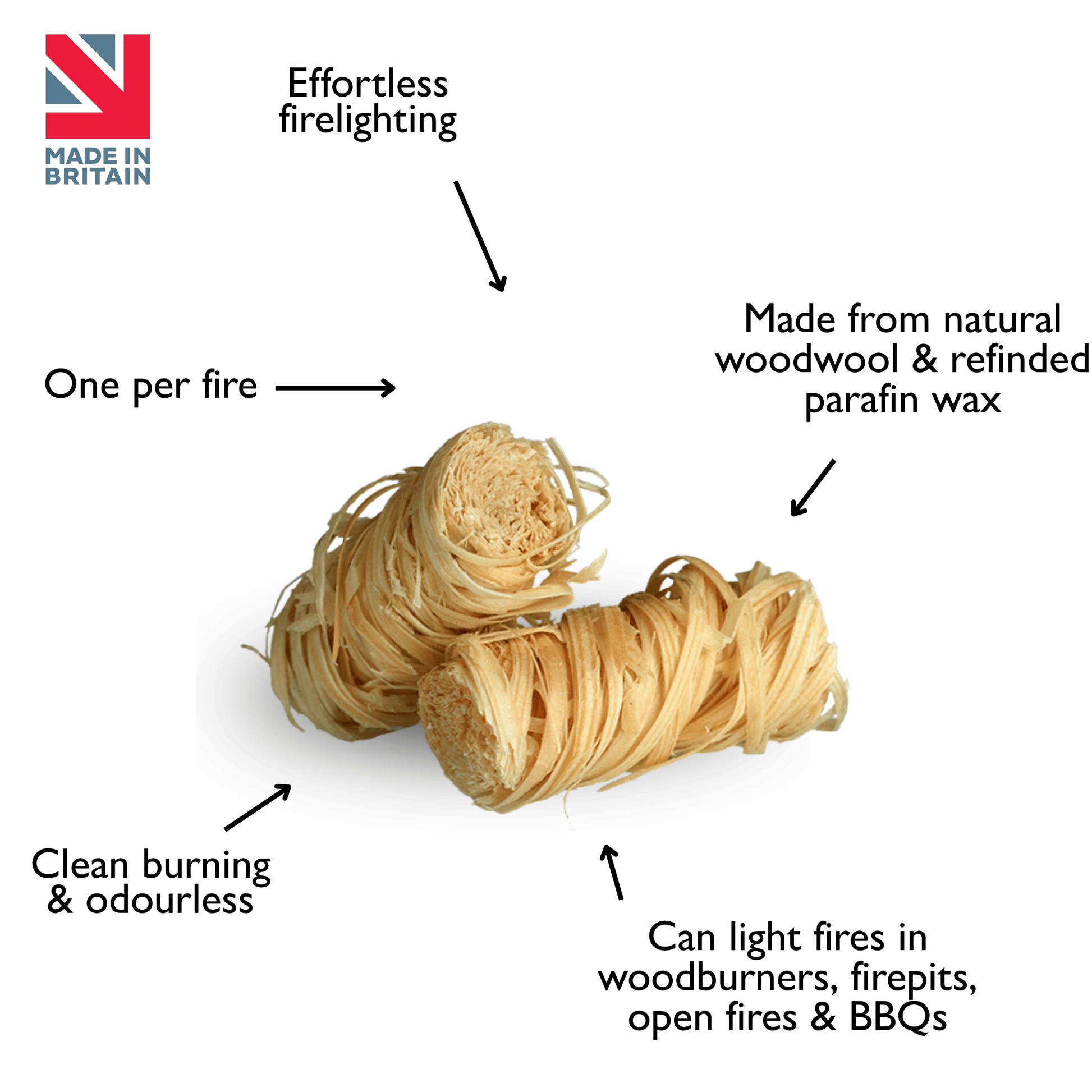 One per fire: Say goodbye to the frustration of fumbling with newspapers, or messy liquid fire starters. Simply, place two logs at the base of your woodburner, add 6-8 sticks of kindling in a Jenga formation on top, place ONE Flamer natural firelighter in the middle of your Jenga formation and light!
