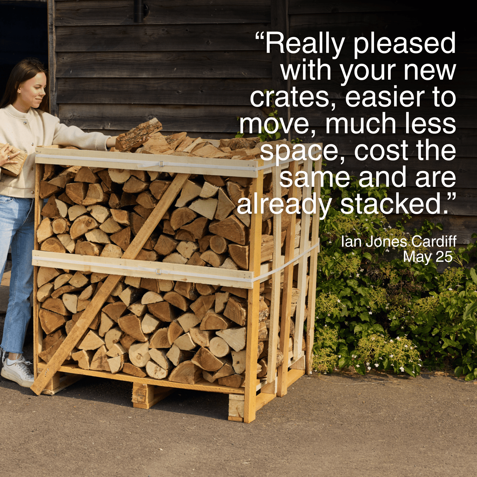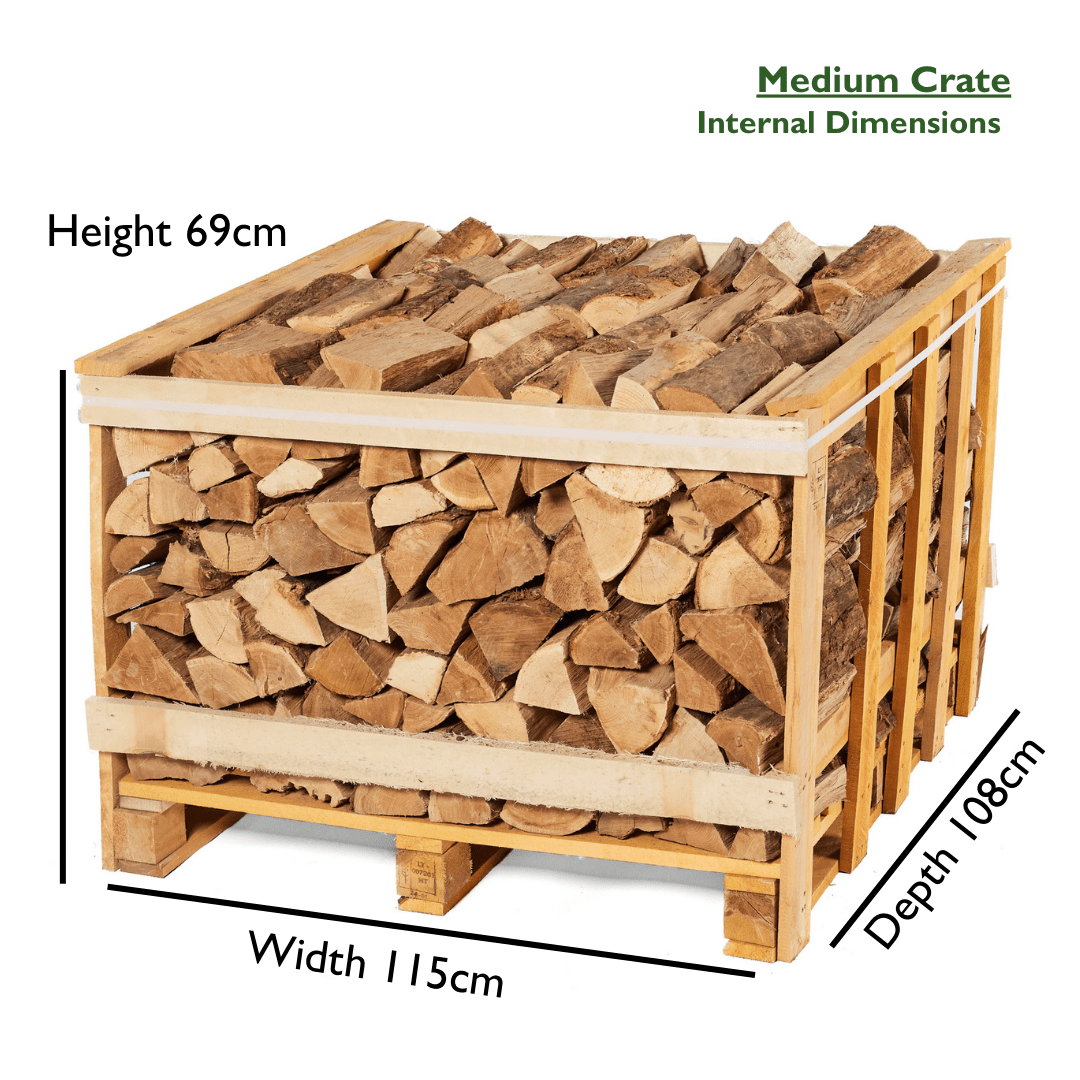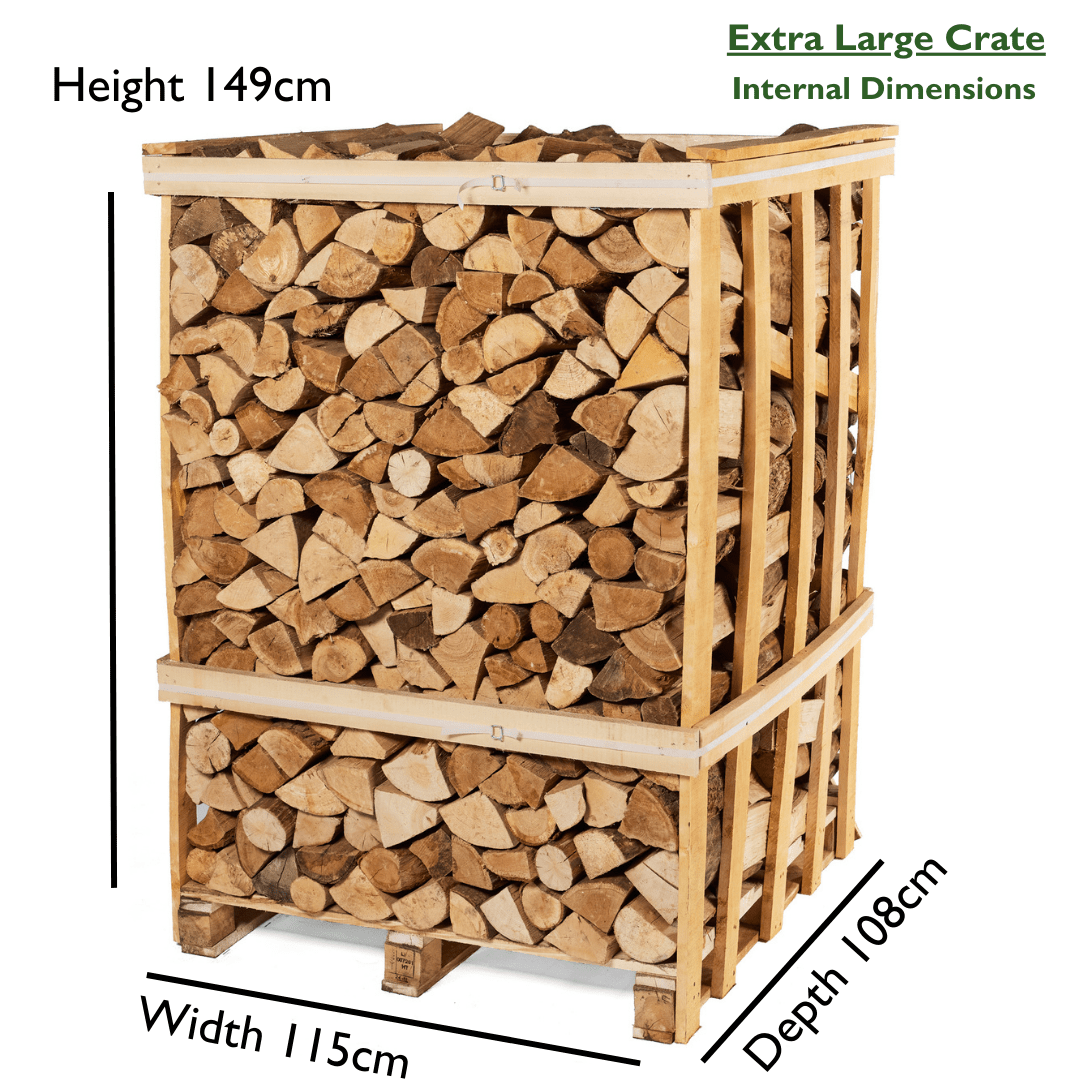 Crate Size: Extra Large Internal Crate Dimensions 1115cm, D108cm, H149cm approx Internal Stacked Volume: Approx 1.84m3 (as per Woodsure guidelines) Internal Loose Volume: Approx 3.08m3 (as per Woodsure guidelines) Species: Mix of hardwoods, primarily oak, ash and birch Log Size: 25cm (standard) Log Length: 25cm (9 ¾") is the standard length, Tolerance on length is +/- 10% Log Diameter: Moisture Content: Below 20% Estimated Lead Time: 3-5 working days