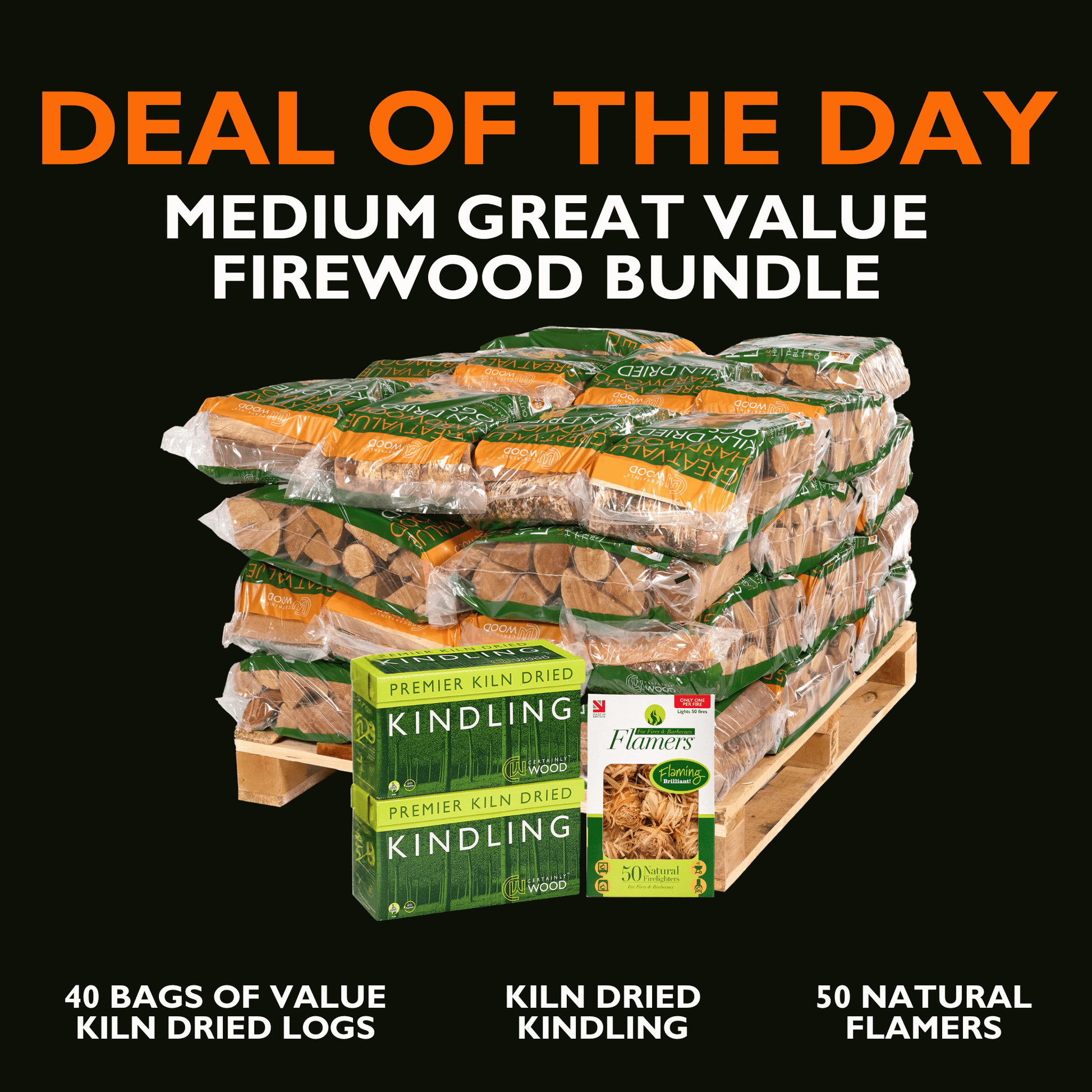 Get winter-ready with our Medium Great Value Firewood Bundle, the perfect Black Friday deal for occasional burners or those topping up their log store. This great-value bundle includes 40 bags of Great Value Kiln Dried Logs (100% silver birch), two boxes of kiln-dried kindling, and 50 Flamers natural firelighters, which is everything you need for quick, clean, and easy fires all season long.